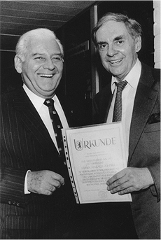„Der Kreisverband Aachen verleiht Herrn Harald Juhnke in Würdigung seiner vorbildlichen Tätigkeit als Botschafter Berlins die Ehrenmitgliedschaft (Aachen, im November 1998)."