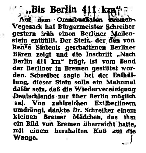 Auf dem Omnibushafen Bremen-Vegesack hat Bürgermeister Schreiber gestern früh einen Berliner Meilenstein enthüllt. Der Stein, der den von Renée Sintenis geschaffenen Berliner Bären zeigt und die Inschrift „Nach Berlin 411 km“ trägt ist vom Bund der Berliner in Bremen gestiftet worden. Schreiber sagte bei der Enthüllung, dieser Stein solle ein Mahnmal dafür sein, dass die Wiedervereinigung Deutschlands nur über Berlin möglich sei. Von zahlreichen Exilberlinern umdrängt, dankte Dr. Schreiber einem kleinen Bremer Mädchen, das ihm ein Bild von Bremen überreicht hatte, mit einem herzhaften Kuss auf die Wange.