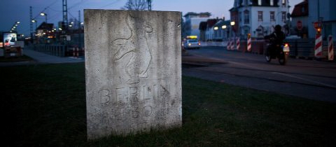 Zentimeter großen hellen Betonstein lesen. „Berlin 530 km“ steht da unter einem